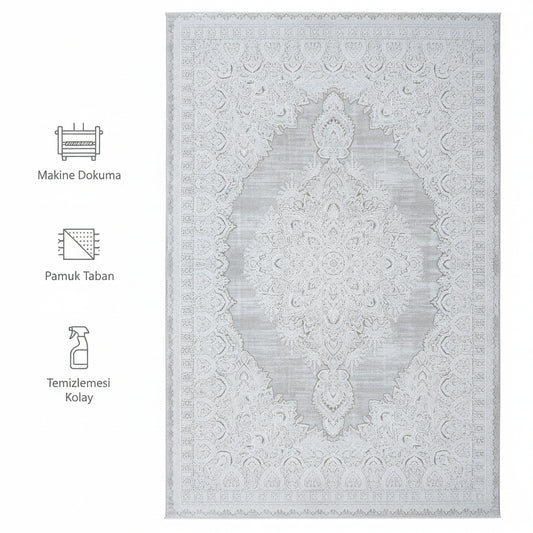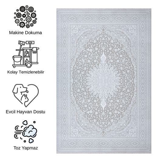 Impressive Serisi Etnik Tasarım Krem Gri Saçaksız 4 Metrekare Salon Yatak Odası Halısı