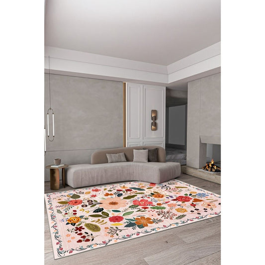 FR143 Pudra Bej Çok Renkli Çiçek Desenli 160x230 Yıkanabilir Kaymaz Taban Halı