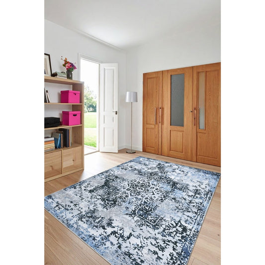 FR103 Mavi Gri Eskitme Desenli 160x230 Yıkanabilir Kaymaz Taban Halı