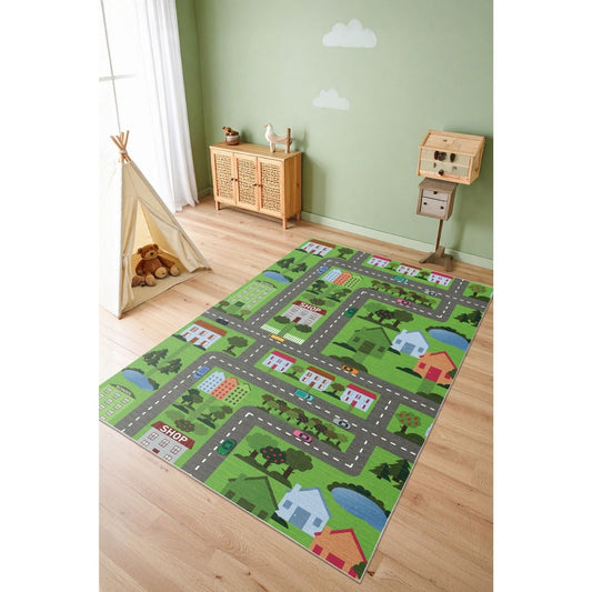 Yeşil Yol Desenli Eğitici Çocuk Odası Halısı