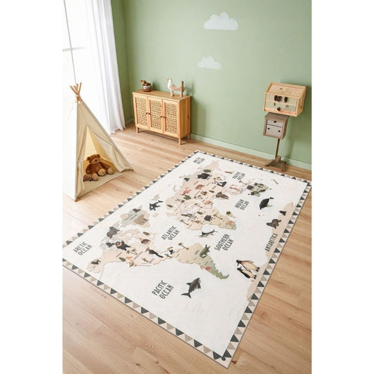 Hayvan Figürlü Dünya Haritası Dijital Baskı Kaymaz Taban Çocuk Halısı FR164