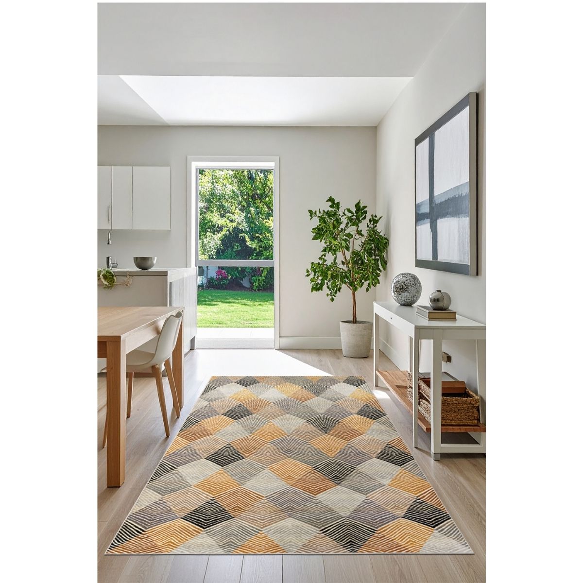 Ottofis FR91 Modern Geometrik Desenli Yıkanabilir Salon Halısı – Hardal Gri Tonları